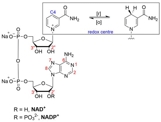 Structure of β-nicotinamide adenine dinucleotide (phosphate), NAD(P)+, indicating sites of modification (red) and redox chemistry (blue).