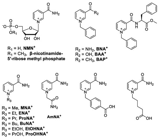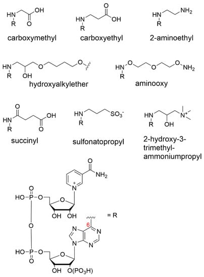 Structure/activity relationship studies of the N(1) and N6 NAD+ analogues have shown that the adenine moiety protrudes out of the active enzyme pocket, which is why substitutions are preferred in the case of this moiety [59]. Focusing on adenine derivatization, generally, N(1)-substituted NAD+ derivatives are seldom used as potential candidates in biocatalytic processes, as they have been found to substantially reduce the enzymatic activity compared with the unmodified cofactors, in addition to being less stable molecules than their N6-substituted counterparts [59,60,61]. However, generalizations about which positions can be functionalized with the greatest retention of the activity are not always appropriate. For example, it was found that the N(1)-2-hydroxy-carboxypropyl NADP+ was more active than N6-2-hydroxy-carboxypropyl with glucose-6-phosphate dehydrogenase, glutamate dehydrogenase and aldehyde dehydrogenase [62].