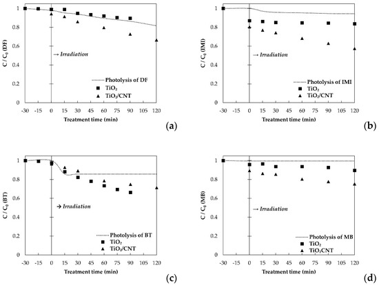 For all studied pollutants model solutions, equilibrium was established in 30 min (Figure 4). Additionally, adsorption on the surface of both photocatalysts was observed, but it was negligible. In consistence with literature findings, [2] adsorption of DF on both photocatalysts was not significant; 1% and 6% on TiO2 and TiO2/CNT, respectively. Equilibrium was achieved during the 30 min in dark, and slightly higher adsorption (+5%) was observed with TiO2/CNT photocatalyst. In the literature [66,71] during the 30 min of dark experiment, adsorption of IMI was negligible. However, in our study, 13% and 20% of adsorption on TiO2 and TiO2/CNT was observed, respectively. It was reported [67] that concentrations of IMI higher than 20 ppm inhibit the photocatalysis due to high adsorption rate of IMI on the photocatalyst’s surface. Since in our study initial concentration was lower than stated (C0 = 10 ppm), equilibrium was achieved. However, occupied sites on the photocatalysts surface by adsorbed IMI molecules could slow down the photocatalysis by TiO2. In their work [69], when adsorption tests of MB on pure MWCNTs was conducted, strong adsorption capacity was noticed, 100% of MB adsorption was noticed during the 120 min. Nonetheless, despite adsorption, TiO2 composites with CNT exhibit increased photocatalytic activity under visible light, and degrade MB more efficiently due to a simultaneous increase of active specific surface. In this study, 4% and 11% of MB adsorption on TiO2 and TiO2/CNT was observed, respectively. When it comes to BT adsorption, it was negligible, where 2% and 4% for TiO2 and TiO2/CNT were observed, respectively. Though, it was reported [72] that MWCNT can be used as a sorbent in solid phase extraction, and successfully used as a pretreatment to pre-concentrate BTs from real water samples.