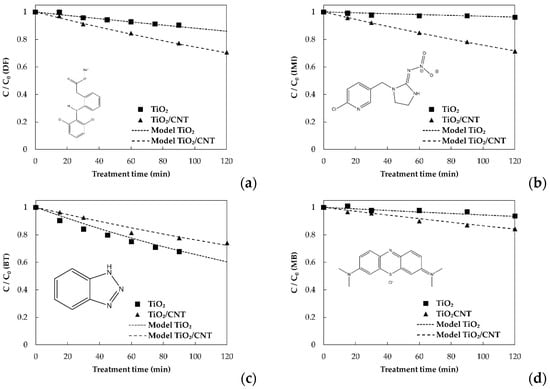 Photocatalytic degradation on TiO2 and TiO2/CNT of: (a) diclofenac (DF), (b) imidacloprid (IMI), (c) 1H-benzotriazole (BT), (d) methylene blue (MB). Fitting of mathematical modelling results along with the obtained experimental data.