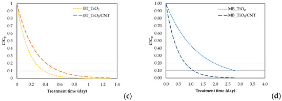 Modeled photocatalytic degradation on TiO2 and TiO2/CNT over period of time to achieve 90% efficiency of: (a) diclofenac (DF), (b) imidacloprid (IMI), (c) 1H-benzotriazole (BT), (d) methylene blue (MB).
