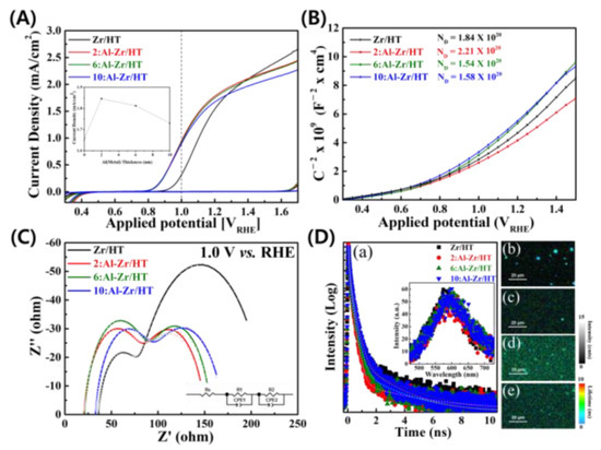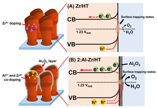 - Subramanian, A.; Mahadik, M.A.; Park, J.W.; Jeong, I.K.; Chung, H.S.; Lee, H.H.; Choi, S.H.; Chae, W.S.; Jang, J.S. An effective strategy to promote hematite photoanode at low voltage bias via Zr4+/Al3+ codoping and CoOx OER co-catalyst. Electrochim. Acta 2019, 319, 444–455. [Google Scholar] [CrossRef]