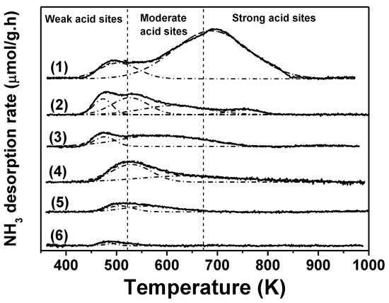 The concentration and strength of surface acid sites were determined by temperature-programmed desorption of NH3 (NH3-TPD). The samples were reduced in situ with H2 (100%) flow for 2 h at the corresponding temperature of reduction. Next, the system was cooled down to 373 K in H2 flow, flushed with He flow and then exposed to an NH3 (1%)/He stream at 373 K for 1 h. The physisorbed NH3 was removed in He flow at 373 K for 0.5 h. Finally, the temperature was raised from 373 to 973 K at 10 K/min−1 in He (60 cm3/min−1) flow, and the NH3 concentration in the effluent was measured by mass spectroscopy (MS) using a Balzers Omnistar (Pfeiffer Vacuum, Asslar, Germany) unit.