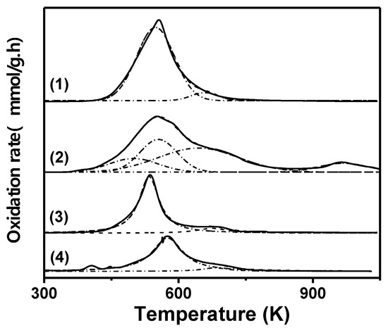 Temperature-programed oxidation (TPO) profiles of Cu/SiO2-PD catalyst. (1) Used catalyst; (2) after H2 treatment at 523 K; (3) after air treatment at 673 K and subsequent reduction in H2 at 523 K; (4) fresh catalyst (TPO experimental conditions: O2 (5%)/N2; 60 mL min−1; 10 K min−1).