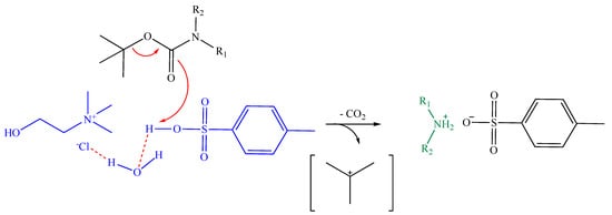 In choosing the best synthetic route for Boc deprotection that meets the criteria required by Green Chemistry, the Pharmaceutical Roundtable of the ACS Green Chemistry Institute has furnished a Guide to Reagents with the aim of guiding the researcher to use more sustainable reagents [36]. The choice of the most suitable reagent was summarized in a Venn Diagram, in which each circle represented a criterion, namely: ‘Scalability’, ‘Greenness,’ and ‘Wide utility’. The ideal reagent should have all three characteristics, and therefore, should be located in the center, between the intersections of the circles. According to this reagent guide, p-toluenesulfonic acid (pTSA) represents the best alternative to TFA for an eco-friendly Boc-deprotection procedure as it is cheap, readily available, and also biodegradable. It is a Brønsted acid catalyst largely investigated for several reactions, given its strong acidity [37,38,39,40]. The use of a DES containing pTSA as a component makes the entire procedure more efficient for the cleavage at room temperature of various amines, amino acid methyl esters, and dipeptides in short reaction times [41,42,43]. In addition, the use of p-toluenesulfonic acid in the DES form allows disadvantages to be overcome, such as its deliquescent behavior and difficulty of recovery.