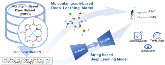 In this study, we first proposed a protocol for assembling the canonical SMILES for a recognized computational database of metalloporphyrins. Afterward, state-of-the-art deep learning models, including three graphical neural network models (hereinafter referred to as molecular graph-based model) and two attention-based natural language processing models (hereinafter referred to as string-based model), were trained on this database and tested for energy gap (E gap) prediction. In addition, the molecular features extracted by these models were visualized using a big data-based visualization algorithm for better interpretability. The overall workflow of this study is shown in Figure 1.