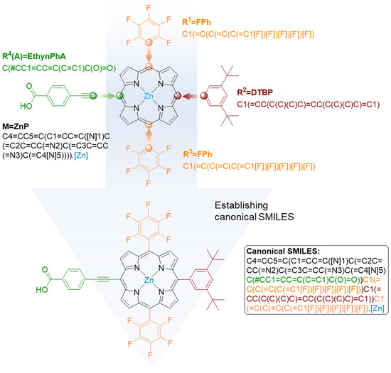 Therefore, we implemented a framework that allows the assembly of canonical SMILES for molecules in PBDD (Figure 2). First, translations from short names of side groups as well as metal centers to their corresponding SMILES fragments were established (e.g., FPh to C1(=C(C(=C(C(=C1[F])[F])[F])[F])[F]), ZnP to [Zn]) (Figure 2, top). Next, these SMILES fragments were concatenated to the SMILES of the porphyrin backbone in a predetermined order to produce the final canonical SMILES for the entire molecule (Figure 2, lower). We designed the concatenation following the pattern of a limited number of examples of metalloporphyrins in PubChem, including porphyrin (CID 66868), Porphyrin Fe(Iii) (CID 73154880), meso-Tetra(4-carboxyphenyl)porphine (CID 86278368), and Mn-TCPP (CID 23789711). All of the established canonical SMILES built for PBDD have been validated by RDKit [33,34].