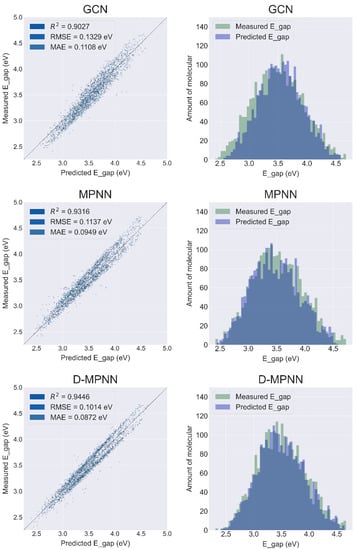 Results of the prediction sets for the models GCN, MPNN, and D-MPNN in the direction of the graph structure. The left column shows the regression plot of the model predictions, and the right column shows the distribution plot of the model prediction data and the data stored in the database. The larger area of the overlap in the data distribution plot on the right indicates better performance of the model prediction.