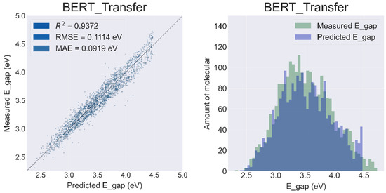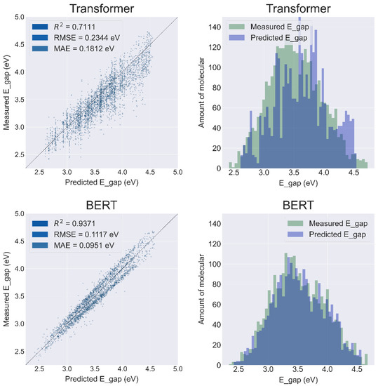 Based on the regression plots (Figure 4, left column), the performance of the BERT model (R2 = 0.9371, RMSE = 0.1117 eV, MAE = 0.0951 eV) is significantly better than the Transformer (R2 = 0.7111, RMSE = 0.2344 eV, MAE = 0.1812 eV). At the same time, the overlap of measured data and the BERT predicted data is significantly larger than that of the Transformer.