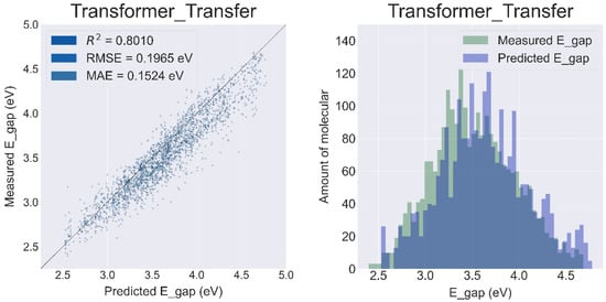 The best pre-trained model named ‘PubChem10M_SMILES_BPE_396_250′ was selected from the ChemBERTa (detailed comparison results are provided in the Supplementary Materials Figure S5). Compared to the model without transfer learning, the R2 of Transformer was improved to 0.8010, and the RMSE and MAE were reduced to 0.1965 eV and 0.1524 eV, respectively (Figure 5).