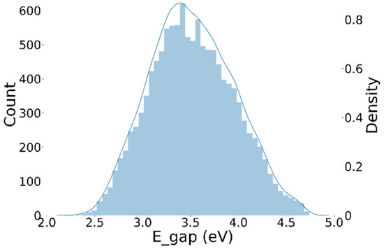 The properties of porphyrins in PBDD include frontline orbital energy levels (HOMO and LUMO), an optical gap, and an energy gap. Among these properties, the energy gap is often chosen to represent the ability of metalloporphyrins to act as reduction catalysts [48]. The energy gap data in the database shows a normal distribution without any significant data imbalance or outliers (Figure 8).
