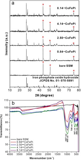 (a) X-ray diffraction patterns of 0.84-CoFePi, 2.50-CoFePi, 4.14-CoFePi, 8.14-CoFePi, bare SSM and iron phosphate oxide hydroxide (JCPDS No. 01-070-5891, peaks marked with red stars represent the XRD peaks from bare SSM); and (b) FT-IR spectra of 0.84-CoFePi, 2.50-CoFePi, 4.14-CoFePi, 8.14-CoFePi and bare SSM.