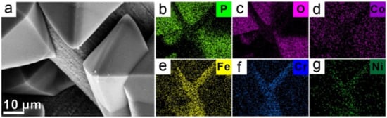 SEM image of (a) 0.84-CoFePi, and EDS elements mapping of 0.84-CoFePi (b) P, (c) O, (d) Co, (e) Fe, (f) Cr, and (g) Ni.