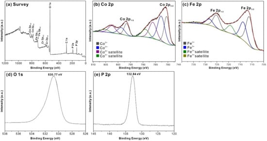 XPS analysis was performed to investigate the surface composition of 0.84-CoFePi (Figure 4). The XPS survey spectrum indicates the presence of Co, Fe, P and O (Figure 4a). Additionally, the atomic percentages of Co, Fe, P and O were 6.97%, 7.69%, 14.35%, and 69.12%, respectively. Figure 4b shows the XPS spectrum in Co 2p region, and the binding energy (BE) at 781.43 eV and 797.15 eV are assigned to be Co 2p3/2 and Co 2p1/2, respectively [52,53]. From the deconvolution of Co 2p spectrum, peaks at the BEs of 782.71 eV and 798.74 eV are assigned to Co2+, while the peaks at 780.52 eV and 796.56 eV are attributed to Co3+ [54,55,56,57]. Furthermore, the calculated atomic ratio of the detected Co element suggests that the Co2+ and Co3+ states exist in a ratio of 6:5. In the XPS spectrum of Fe 2p region (Figure 4c), the BEs at 711.92 eV and 725.45 eV are corresponding to the peaks of Fe 2p3/2 and Fe 2p1/2, respectively [58,59]. In addition, the deconvoluted peaks of Fe 2p at the BEs of 711.15 eV and 725.16 eV are associated with Fe2+, while the peaks at 713.71 eV and 728.18 eV are from Fe3+ [60,61,62,63]. Moreover, the atomic ratio of Fe2+/Fe3+ is 7:4. The peak in the XPS spectrum of O 1s and P 2p (Figure 4d,e) was observed with the BEs of 530.77 eV and 132.84 eV, respectively [64,65,66,67]. Therefore, from the results of XRD, FT-IR, EDS, and XPS we concluded that the crystallite is mainly composed of randomly incorporated cobalt ions on iron phosphate oxide hydroxide.