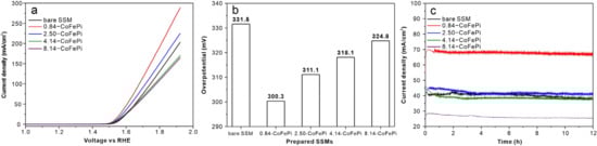 The evaluation in OER activity of all prepared catalysts is shown in Figure 5a–c. Polarization curves of prepared OER catalysts and bare SSM were recorded at the potential window from 1.0 V to 1.924 V vs. RHE, with the scan rate of 10 mVs−1 (Figure 5a). The current density at the maximum potential applied in LSV, 0.84-CoFePi showed the highest value which was increased by 42% (203.6 to 289.1 mAcm−2) compared to the bare SSM. The overpotentials of all catalysts required to drive OER at 10 mAcm−2 were lower than bare SSM (Figure 5b). Typically, 0.84-CoFePi had the lowest overpotential of 300.3 mV, which was decreased by 31.2 mV from bare SSM (331.5 mV). The OER activity of 0.84-CoFePi was compared with recently reported Co or/and Fe based catalysts in Table S1 in Supplementary Materials. In lower acid concentration, smaller crystals precipitate on SSM, which is expected to have higher OER activities due to the larger surface area [68,69,70,71,72]. To evaluate the stability of the products, bulk electrolysis was carried out (Figure 5c). The average current density was 40.2 mAcm−2 (bare SSM), 67.8 mAcm−2 (0.84-CoFePi), 42.0 mAcm−2 (2.50-CoFePi), 38.5 mAcm−2 (4.14-CoFePi), and 26.2 mAcm−2 (8.14-CoFePi). Compared to bare SSM, 8.14-CoFePi showed very poor OER activity, which was decreased in current density by 34.8%. However, 0.84-CoFePi showed drastic increase by 68.8% in current density. Furthermore, the loss in current density after 12 h of bulk electrolysis in 1 M KOH (pH 14) was 3.1% with better sustainability than bare SSM (11.8%).