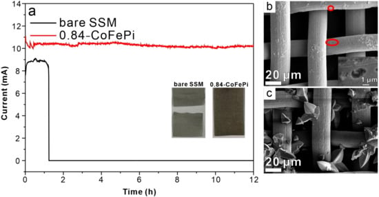 It is well known that the chloride ions and low pH condition accelerate corrosion of stainless steel. Li et al. reported the corrosion behavior of stainless steel by electrochemical method performed in an aqueous solution of sulfuric acid (pH 2) with different NaCl concentration. Their results suggested that chloride ions degraded the passive film of stainless steel [73]. We accomplished the bulk electrolysis of bare SSM and 0.84-CoFePi to test the stability to H2SO4 solution (pH ≈ 3) and 0.1 M chloride ion (Figure 6b). Bare SSM was detached from sample holder due to the corrosion after 90 min of electrolysis, causing the drop in current density to zero. On the other hand, 0.84-CoFePi showed stable current density for 12 h. The loss in current density of 0.84-CoFePi after 12 h of bulk electrolysis was less than 3.2%. SEM analysis was accomplished to verify the surface morphology of bare SSM and 0.84-CoFePi (Figure 6b,c) after the bulk electrolysis. The small holes (insert of Figure 6b) appeared in bare SSM even after short OER time of 90 min, indicating that severe corrosion occurred. On the other hand, the mesh surface of 0.84-CoFePi was clean after 12 h of OER with no trace of corrosion. Therefore, our catalyst had improved durability in acidic solution compared to bare SSM. This result was predicted from the result of SEM previously discussed in Figure 1 in which the presence of cobalt species dramatically inhibits corrosion of SSM.