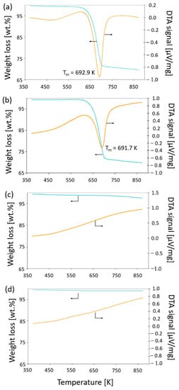 DTA-TGA-MS studies were carried out to determine two parameters, namely the amount of water (m/z = 18 signal was monitored) lost by the sample and the maximum temperature of Mg(OH)2 decomposition. Figure 1 shows the TG and DTA curves obtained for four of the samples, namely MgO-473, MgO-573, MgO-673 and MgO-873. The DTA-TGA-MS analysis revealed that the MgO-473 sample lost 30.39% of its weight (Figure 1a). The calculated weight loss for anhydrous Mg(OH)2 is 30.89%, which is within the determination error of the measurement. The Tmax for the decomposition of Mg(OH)2 is 692.9 K (Figure 1a). For the MgO-573 sample (Figure 1b), the weight loss (28.05%) is lower than the theoretical value, indicating that a partial dehydration of Mg(OH)2 took place during heating a sample at 573 K. For this sample, the highest rate of the hydroxide dehydration was observed at 691.7 K. A small weight loss (2.43%) observed for the MgO-673 sample (Figure 1c) indicates that the process of dehydration of Mg(OH)2 has already finished. This is also true for MgO-873 (Figure 1d). It is noteworthy that the Tmax for MgO-473, as well as for MgO-573 are distinctly higher than those reported in literature, e.g., for Mg(OH)2 obtained from the hydration of a commercial MgO of reagent purity the Tmax of 651 K has been reported [7]. However, it is commonly known that TG results are extremely sensitive to heating rates. A typical effect of an increase of the heating rate by 5 deg min−1 is to shift the maximum rate to a temperature about 20–40 deg higher than found at 1 deg min−1 [28]. During TG measurement when sample of Mg(OH)2 is heated with a heating rate of 1 deg min−1 the dehydration process commences at 558 K and ceases at 653 K [28]. Indeed, it was shown by us that Tmax for MgO-473 samples are equal 692.9 and 657.5 K for heating rates 10 and 2 deg min−1, respectively. It gives a 35.4 deg difference which falls in line with literature data.