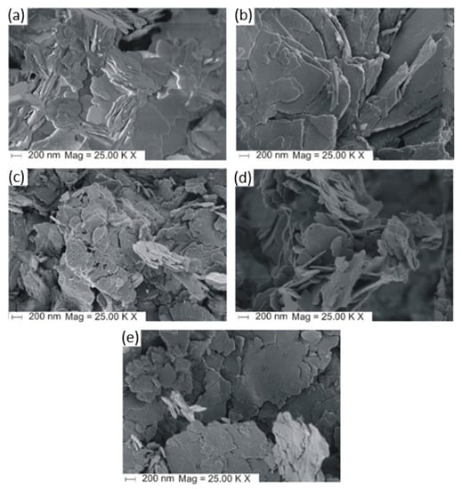 In contrast, the SEM images of different MgO-T samples (Figure 3) do not reveal a substantial difference between the texture of Mg(OH)2 and MgO samples. All of the studied samples exhibit a flaky appearance.
