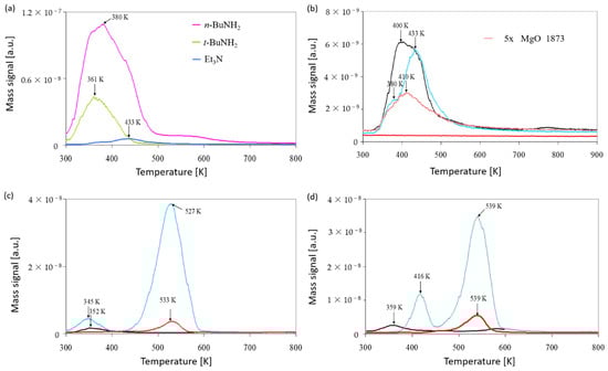 As known from the literature reports [21,38], as well as the authors’ own papers [39], there are basic sites that react with 4-chloroaniline as the indicator (H− > 26.5) on the surface of pure magnesium oxide. According to Tanabe’s definition, substances with sites whose basic strength exceeds 26.5 can be regarded as solid superbases [40]. This means that these strong sites seem to be able to deprotonate the studied primary amines. In other words, the desorption peak of n-butylamine (Figure 4a) mainly corresponds to amine molecules which desorb from Lewis acidic as well as from basic sites of extremely high basicity, with only a minor contribution from Brønsted acidic sites.