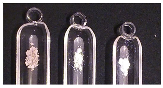 Samples of magnesium oxide obtained by calcination at 873 K of the three precipitates of magnesium hydroxide; 1st, 2nd and 3rd precipitation in sequence from left to right.