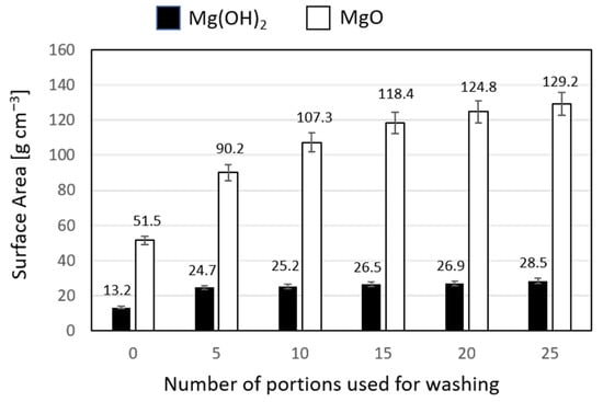 In both cases, the lowest value was observed for the unwashed magnesium hydroxide. The area of these two compounds was 15 and 52 m2·g−1, respectively. The biggest increase of the surface area is noted between the unwashed sample and that washed with five portions of water. It is noteworthy that although the consecutive portions of water have only a small effect on the area of the hydroxide, they do impact the values attained for the resulting magnesium oxide, which continuously rises and equals 129 m2·g−1 for 25 portions of washing. (Figure 8).