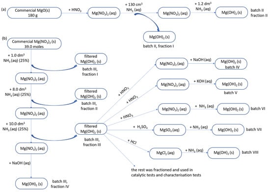 Reaction pathways: starting materials, dissolving solutions and precipitating agents used. (a) commercial MgO as a starting material, (b) magnesium nitrate as a starting material.