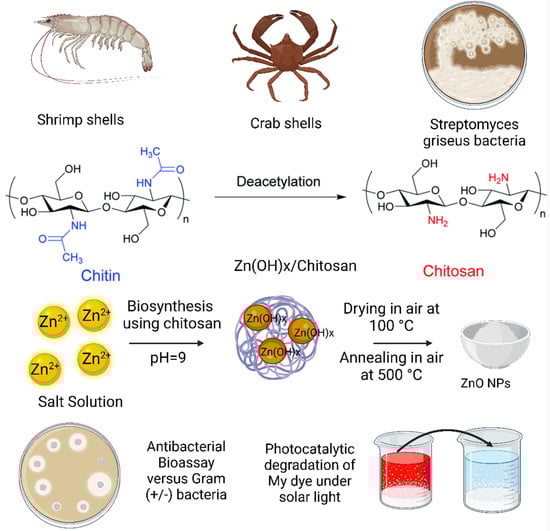 The schematic representation of the sol-gel synthesis of ZnO NPs using different types of chitosan (sources: shrimp shells, crab shells, and Streptomyces griseus bacteria) and their application in antibacterial and photocatalytic degradation of MB dye.