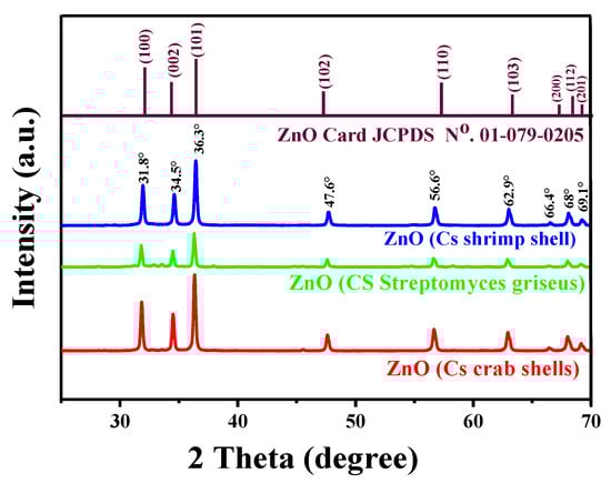 The XRD diffraction pattern of the synthesized ZnO NPs from chitosan of shrimp shells, crab shells and Streptomyces griseus bacteria.