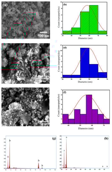 SEM was used to examine the morphology of synthesized ZnO NPs from different chitosan (see Figure 3). The ZnO NPs were characterized by random spherical shapes (Figure 3a,c,e). The reaction parameters including the concertation of ZnCl2, source and amount of chitosan, temperature, and pH, affect the shape and particle size of the ZnO NPs [21]. Najoom et al. [22] observed similar morphologies. The particle size distribution histograms show indicated that the average size distribution of the ZnO NPs by crab shells was around 30–80 nm (Figure 3b), 20–70 for ZnO by shrimp shells (Figure 3d), and 35–75 nm for ZnO NPs by Streptomyces griseus bacteria (Figure 3f). Different sources of chitosan lead to a different degree of stabilization of Zn(OH)2 NPs against agglomeration. This leads to the formation of ZnO NPs with the observed variation in particle sizes. The crystallite size is smaller than the particle size determined by the SEM analysis. This may indicate that the prepared ZnO NPs are polycrystalline. According to the SEM/EDS elemental analysis (Table 2), O and Zn were present in the ZnO NPs of shrimp shells with an atomic fraction of 52.01% and 47.99%, respectively, and in the ZnO NPs of crab shells with an atomic fraction of 52.59% and 34.16%, respectively. According to ZnO NPs of Streptomyces griseus bacteria, the atomic masses of O and Zn in the ZnO NPs were 26.80% and 51.13%, respectively.
