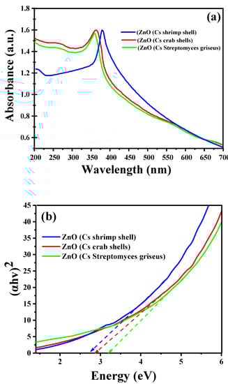 ZnO NPs are well-known photocatalysts that are generally active in UV light due to their wide band gap. The efficiency of ZnO NPs strongly depends on their electronic band structure, UV-Vis absorption, and band gap energy. It has been reported that the generated optical band gaps of ZnO nanostructures range from 2.7 eV to 4.7 eV for ZnO NPs formed in different solvent systems [23,24]. The bandgap energy for an efficient photocatalyst should be less than 3 eV to extend light absorption into the visible range and efficiently utilize solar energy. The UV-Vis spectra of the ZnO NPs synthesized from different chitosan sources are shown in Figure 4a. The UV-Vis spectra of the ZnO NPs synthesized from different chitosan sources (crab shells, crab shells and Streptomyces griseus bacteria) show distinct absorption bands at 343, 330 and 328 nm, respectively. The absorption spectrum of the ZnO NPs is in agreement with that of Vijayakumar et al. [25] and Vaseem et al. [26]. The band gap energy of synthesized ZnO NPs was calculated by plotting (hv)2 versus energy (eV) as shown in Figure 4b. The band gap energies of ZnO NPs synthesized from chitosan of shrimp shells, crab shells and Streptomyces griseus bacteria are 2.73, 2.87 and 3.21 eV, respectively. These results confirm that the use of chitosan during the ZnO NPs synthesis has significantly affected the optical properties of the ZnO NPs and reduced the bandgap energy to a minimum.