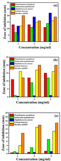 The antibacterial activity of ZnO NPs from chitosan of (a) shrimp shells, (b) crab shells and (c) Streptomyces griseus bacteria at various concentrations against different bacteria.