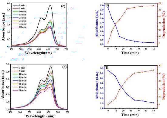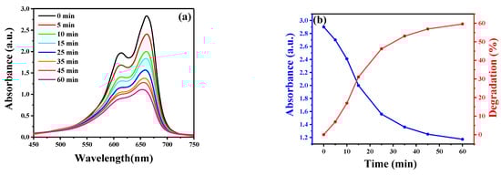 The equilibrium concentration of the dye on the adsorbent is represented by qe (mg·g−1). The initial and equilibrium concentrations of the dye solution are C0 and Ce (mg·L−1), respectively. In this case, m is the weight of ZnO used (g), and V is the volume of the dye solution (L). UV-vis spectroscopy is used to observe the stimulation (Figure 6). Once ZnO NPs are introduced as components in the reaction mixture, the dye is catalytically reduced. Equation (2) was used to calculate the photocatalytic degradation efficiency (%) of the dye MB by the ZnO adsorbent [36,37]: