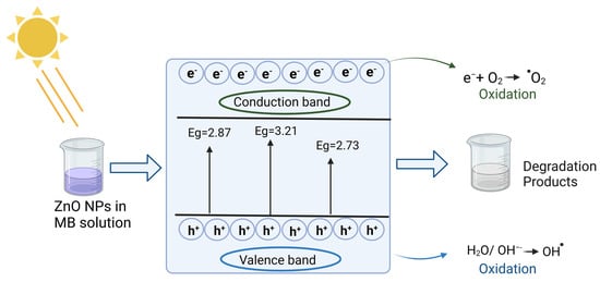 According to Equations (3)–(9), the photoexcitation, charge separation and migration, and finally, oxidation-reduction reactions at the surface, the reactive species formed during the irradiation of ZnO NPs are (VB), h+, O2−, and OH [38]. The ZnO NPs are exposed to solar radiation (Figure 7), which causes electrons to move from VB to CB. The resulting energy is larger than the band gap of ZnO (2.37, 2.87, 3.21 eV), which promotes the formation of conduction band electrons (e) and valence band holes (h+). The photogenerated holes on the VB could either directly oxidize the adsorbed MB dye or directly react with hydroxyl (OH˙). Meanwhile, oxygen (O2) adsorbed on the surface of ZnO NPs can be converted into superoxide radicals (O2) by photoelectrons at the CB. For this reason, both OH˙ and the generated O2 can photocatalytically degrade the MB dye [39,40].
