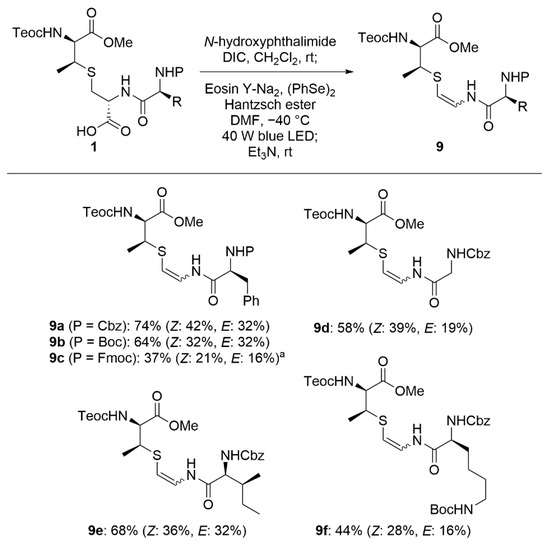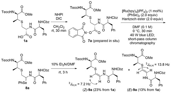Next, we surveyed the formation of the AviMeCys unit using 1a as the model lanthionine-bearing peptide as shown in Scheme 3. Given the immediate capture of the resulting radical species during the oxidative decarboxylation [28,29,30], diphenyl diselenide was selected as a radical trapping agent [31,32]. In addition, we envisioned that the resulting N,Se-acetal would be converted into the corresponding β-thioenamide without losing the β-methylcysteine unit due to high leaving activity of phenylselenolates [33,34,35]. According to the reported procedures [32,36,37], the NHPI ester 7a, prepared from 1a in situ, was treated with 1 mol% of [Ru(bpy)3](PF6)2 as the photocatalyst in the presence of the Hantzsch ester and diphenyl diselenide under 40 W blue light-emiting diode (LED) irradiation. The following β-elimination of the obtained selenoether 8a by treatment with triethylamine furnished the β-thioenamieds (Z)-9a and (E)-9a in 23% and 13% yields, respectively. The geometry of olefins in (Z)-9a and (E)-9a was determined by 1H nuclear magnetic resonance (NMR) spectroscopy through the coupling constants (3JH,H = 7.2 Hz for (Z)-9a, and 13.8 Hz for (E)-9a) of isolated compounds [19].
