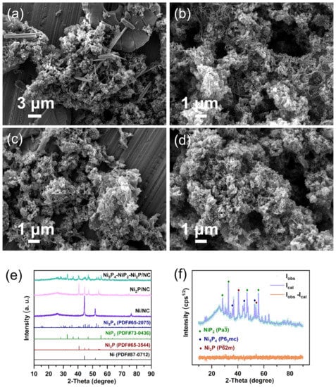 SEM images of (a) Ni(bpy)(NO3)2/g-C3N4/Ni(dmgH)2, (b) Ni/NC, (c) Ni2P/NC, and (d) Ni5P4-NiP2-Ni2P/NC; (e) XRD patterns of Ni/NC, Ni2P/NC, and Ni5P4-NiP2-Ni2P/NC samples; (f) XRD experimental and fitting patterns for Ni5P4-NiP2-Ni2P/NC. G-of-F (Rwp%) parameter is 1.12 (4.1).