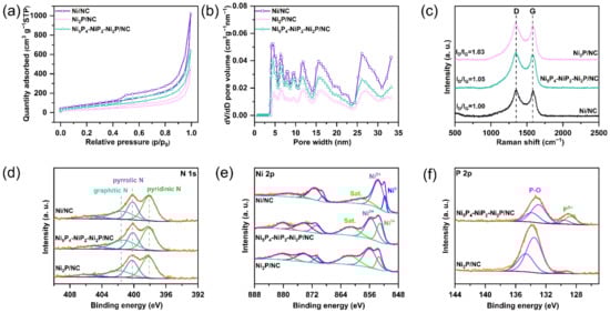 (a) N2 adsorption–desorption isotherms and (b) pore-size distribution of the samples Ni/NC, Ni2P/NC, and Ni5P4-NiP2-Ni2P/NC; (c) Raman spectra of Ni/NC, Ni2P/NC, and Ni5P4-NiP2-Ni2P/NC; High-resolution XPS spectra of (d) N 1s, (e) Ni 2p, and (f) P 2p for all samples.