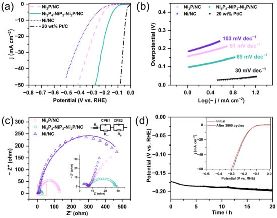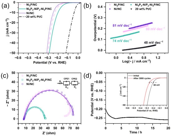 where Cs is the specific capacitance, often assumed to be 40 μF·cm−2 [57]. The stability of Ni5P4-NiP2-Ni2P/NC was evaluated by accelerated degradation experiment and chronopotentiometry in both acidic and alkaline solutions. For accelerated degradation test, cyclic voltammetry (CV) measurement was performed with a scan rate of 100 mV s−1 between −0.32 V and 0.18 V vs. RHE for 3000 cycles, and the LSV curves before and after the cycling were recorded at 5 mV s−1. Chronopotentiometry measurement was conducted under a constant current density of 10 mA cm−2 for up to 70,000 s.