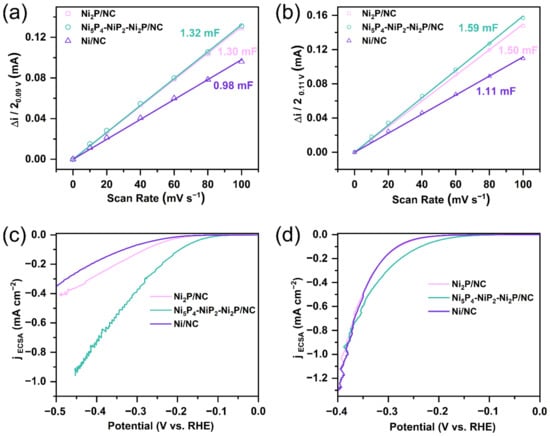 The capacitive currents of three samples were fitted as a function of scan rates from 10 mV s−1 to 100 mV s−1 in (a) 0.5 M H2SO4 and (b) 1 M KOH solutions; the polarization curves normalized by ECSA for the three catalysts in (c) 0.5 M H2SO4 and (d) 1 M KOH solutions.