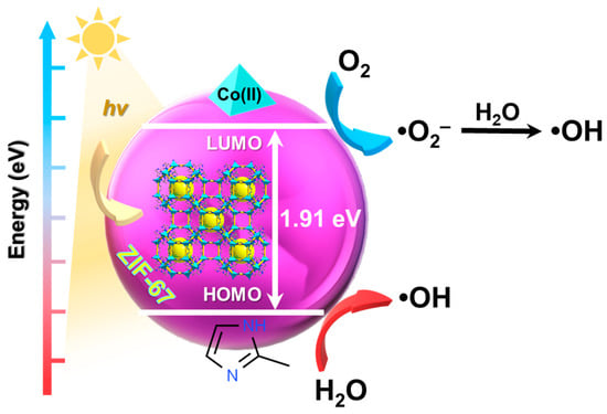 ZIF-67, synthesized via hydrothermal reaction from cobalt salts, (e.g., Co(NO3)2·6H2O) and 2-methylimidazole as organic linker, has a large specific surface area and is highly porous, hence it exhibits numerous applications in photocatalysis. The mechanism of the photocatalytic degradation of dyes using ZIF-67 is simple (Figure 2). In order to regain the stable state, the electron is taken from the water molecule causing its oxygenation into •OH active form. Additionally, the electron that is present in the LUMO and the oxygen from ZIF-67 surface form •O2− that is subsequently converted into •OH. Dye molecules may be cleaved by these radicals to successfully conduct the photodegradation [,].