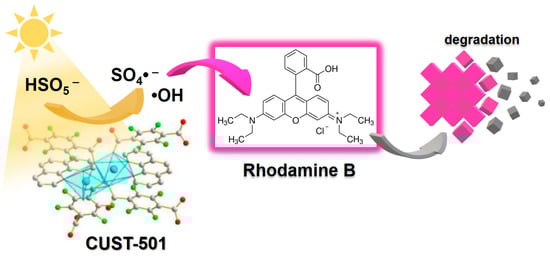 CUST-501–[Co2(H2O)(tfBDC)2(Phen)2] (tfBDC = tetrafluoroterephtalic acid; Phen = 1,10-Phenanthroline monohydrate) is another MOF that has been used to eliminate dyes such as rhodamine B from water []. Its role as a catalyst is based on activating peroxymonosulfate (HSO5−) under UV irradiation, which triggers the generation of free radicals (SO4•−) (Figure 3). A total of 100% of rhodamine B was degraded in about 15 min, which indicates that CUST-501 has potential in water treatment. Additionally, the photocatalyst shows unchanged efficiency after two recycling cycles.