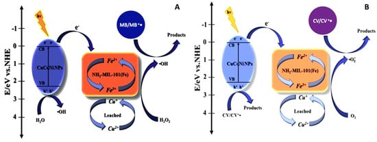 Scheme showing the photodegradation mechanism of: (A) methyl blue; (B) crystal violet by NH2-MIL-101(Fe)@CuCoNi (Reprinted with permission []. Copyright 2020 Elsevier).