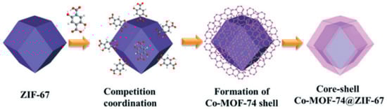 MOFs can create core-shell structures, as in Co-MOF-74@ZIF-67 catalysts via ligand exchange. While both MOFs consist of cobalt in nodes, they differ in linkers: ZIF-67 has 2-methylimidazole and Co-MOF-74 contains 2,5-dihydroxyterephthalic acid. ZIF-67 constitutes the core of the material and through controlled ligand exchange, it was possible to build Co-MOF-74 on its surface, which formed the shell (Figure 6). During the core-shell formation, it was feasible to control the thickness of the outer MOF layer from 10 to 50 nm. The composite showed high oxygen evolution potential during water oxidation at pH 9.0 under visible light (420 nm). Moreover, it was recycled up to five times without a significant decrease in its activity. The oxygen generation efficiency was found to be for ZIF-67-9.8 µmol, and for Co-MOF-74-11.8 µmol, respectively. Combining the materials and using the system with the thickest shell resulted in 15 µmol of O2 evolution. Attempts to increase the thickness of the shell by decreasing the molar ratio of ZIF-67 to the modifier led to the disintegration of particles morphology and amorphous bulk crystals were formed. However, this procedure can be extended, and different tricarboxylic linkers could be used to build up the shells of other types. It indicates that the presented method has a chance for further development in the light-driven oxygen evolution [].
