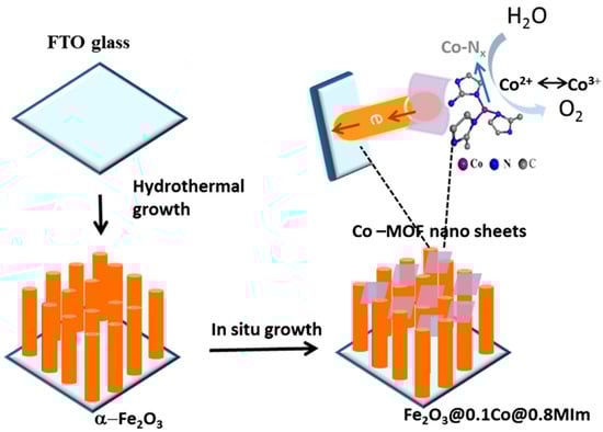- Zhang, Q.; Wang, H.; Dong, Y.; Yan, J.; Ke, X.; Wu, Q.; Xue, S. In situ growth of ultrathin Co-MOF nanosheets on A-Fe2O3 hematite nanorods for efficient photoelectrochemical water oxidation. Sol. Energy 2018, 171, 388–396. [Google Scholar] [CrossRef]