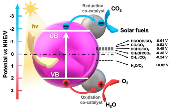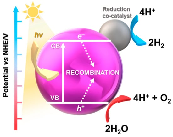 Water splitting is a process of evolving hydrogen and oxygen (2H2O → 2H2 + O2), the main purpose of which is to achieve scalable and cost-viable solar hydrogen production (Figure 8). In recent years, interest in this process has been growing has it does not generate greenhouse gases. One of the main approaches for water splitting and the generation of H2 is to use photocatalysts with appropriate thermodynamic potential, a narrow band gap to harvest light, and an indication of resistance to photocorrosion []. Therefore, to enhance the efficiency of photoelectrocatalytic (PEC) water splitting, co-catalysts on semiconductors are often used. They not only provide additional catalytically active sites, but also facilitate redox reactions by suppressing charge recombination and unwanted reverse reactions []. At the moment, the quantum efficiency of current photocatalysts is usually less than 10%. There are reports of external quantum efficiencies up to ca. 96% [], but these are rarely reproduced. Effective photocatalytic water splitting requires complex semiconductor systems coupled with catalysts operating in a broad light spectrum.