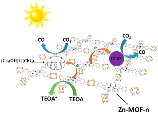 Ye et al. [] reported two composites–ZIF-67 with Zn-MOF and a dinuclear cobalt-complex [Co2(OH)L](ClO4)3 (L = N[(CH2)2NHCH2(m-C6H4)CH2NH(CH2)]3N) with Zn-MOF. The zinc-based MOF was applied as a photosensitizer. The cobalt complex and ZIF-67, both acted as co-catalysts present in the solution and accompanied the CO2 photoreduction to CO (Figure 11). They increased the formation of CO and the selectivity over H2 evolution. TONs and CO selectivity were 26.2, 78.9% for the bulk Zn-MOF and 68.7, 81.5% for Zn-MOF/Co-complex. In the case of Zn-MOF/ZIF-67, values were the highest-117.8, 91.0%. The photoelectrochemical impedance and photoluminescence studies suggest that the increased catalytic activity comes from the improved charge-transport capability, enhanced charge separation, and longer life duration of the photogenerated charge carriers.