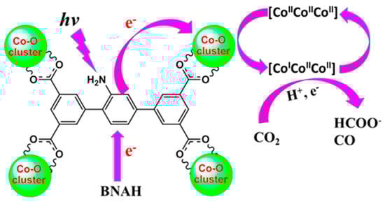 A similar efficiency of CO2 reduction but toward HCOO− generation (456 μmol g−1 h−1) was achieved by the trinuclear CoIICoIICoII MOF with a band gap of 2.95 eV. The Co-MOF [Co3(HL)2 × 4DMF × 4H2O] (H4L = 2′-amino-[1,1′:4′,1″-terphenyl]-3,3″,5,5″-tetracarboxylic acid) exhibited CO2-reductive abilities in the presence of BNAH (1-benzyl-1,4-dihydronicotinamide) as the electron donor. Photoinduced electron transition (PET) was investigated, and single electron transfer was established in the trinuclear clusters. One electron was transferred from [Ru(bpy)3]2+ to Co-MOF, as follows: [CoIICoIICoII] to [CoICoIICoII] and from [CoICoIICoII] to [CoICoIICoI]. This dynamic trinuclear system acted as the catalytically active sites responsible for CO2 reduction (Figure 12) [].