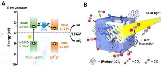 Scheme representing (A) the band levels and electron transfer among the [Ru(bpy)3]2+ photosensitizer, ZIF-67@PPy co-catalyst, and CO2/CO redox pair. On the right (B) the photocatalytic CO2 reduction process on the cubic ZIF-67@PPy composite in the presence of [Ru(bpy)3]2+ (Reprinted with permission []. Copyright 2021 Elsevier).