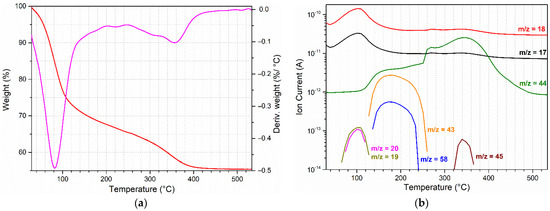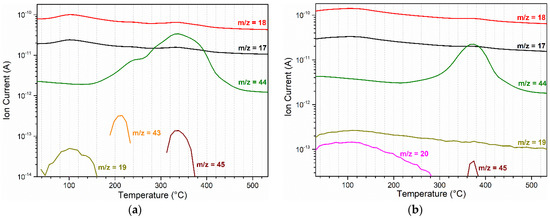 The profiles of gaseous species released from nanocrystalline TiO2-ACAC and TiO2-A300 samples are shown in Figure 2. The volatilization stages of TiO2-ACAC (Figure 2a) follow a similar path as TiO2-A-RT (Figure 1). TiO2-ACAC water release occurs in the temperature range between 30 °C and 150 °C, followed by a two-stage release of molecules due to ACAC oxidation above 150 °C. In the interval from 150 °C to ~265 °C, only acetyl ions (m/z = 43) and CO2 (m/z = 44) were released. In addition, in the third temperature stage (300–450 °C), CO2 (m/z = 44 and 45) and water release were reported. The absence of acetone release in the TiO2-ACAC xerogel probably occurred due to overnight drying at 100 °C, reducing the excess ACAC content in the sample.