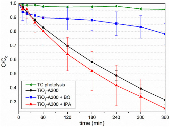 The TC photodegradation with the addition of BQ was significantly reduced to 21.8% ± 7.6% using TiO2-A300 after 6 h (Figure 5). The reduction observed in our study agrees with the literature, where different ceramic heterojunctions showed low TC degradation efficiency with the addition of BQ under high power UV or UV-Vis light sources (>300 W) [6,42,44]. He et al. [5] reported that •O2− and H2O2 radicals are capable of attacking the benzene ring of tetracycline, oxidizing the N-dimethyl group and the -C(O)NH2 group, suggesting that •O2− plays an important role in the photodegradation pathway of TC. Therefore, the TC degradation behavior observed in Figure 5 is mainly due to the efficient generation of •O2− radicals by TiO2-A300 CTC.