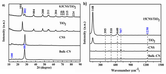 (a) Powder XRD patterns of bulk-CN, CNS, TiO2, and 0.5CNS/TiO2. (b) Raman spectra of bulk-CN, CNS, TiO2, and 15CNS/TiO2. Figure S1 shows the PXRD of the rest of nanocomposites.